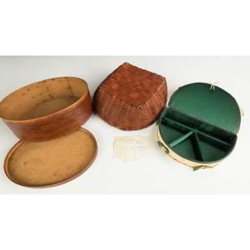 | Sewing basket, original red stain and blue liner; some loss to feet; Dia. 10". Sabbath Lake Shaker's Maine, sewing box; some wear to edges; W 9". |