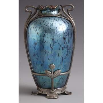 | Lot #: 580 Fine Loetz Blue Iridescent Oil Spot Vase w/Stylized Floral Pewter Mounts |