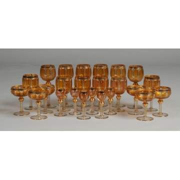 | 587. Bohemian Glass Tableware, Set of 48, 12 each Cordial, Champagne, White & Red Wine. Amber cut to clear. Very good. Max. Ht. 6 1/2" Est. $1,000-$1,500 |