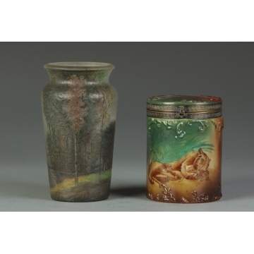 | 608. Handel Teroma Chipped Ice Scenic Vase, Sgn. & #4208. Exc. Ht. 7 3/4" Est. $300-$500 609. Handel Humidor, Stamped Handel Ware & #40601J. Exc. Ht. 5 3/4" Est. $200-$300 |