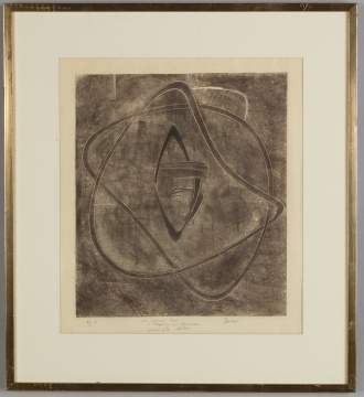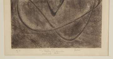 | Signed in pencil, lower right, Gabo. "For Seymour Knox in Friendship and Appreciation, March 1968, Gabo." Of 6. Monoprint. |