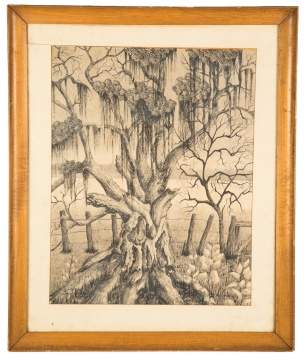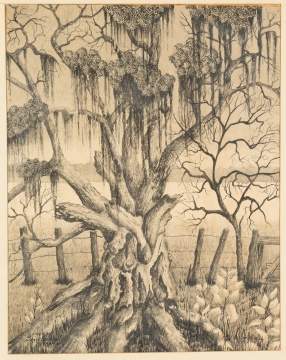 | Signed lower right, H.W. Vanderwall, 1952. Signed lower left, "Live Oak, Des Allemands, Louisiana." Charcoal and ink. |