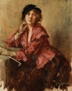 | Lot #: 115 Fernand Toussaint (Belgian, 1873-1956) Young Lady with Red Coat and Umbrella |