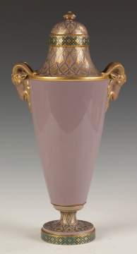 | C. 1900. Artist signed JA. Rams head handles; gold enameling. |