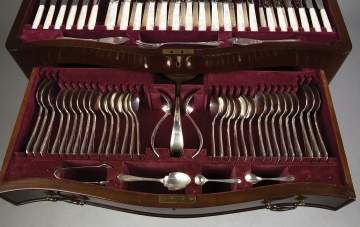 | Service for 12. Custom made walnut chest. 180 pieces; 161 ozt. weighable. Pearl Handled Flatware: 12 Knives, 9"; 12Knives, 8”; 12Knives, 8 1/4"; 12 Knives, 7 1/8"; 12 Forks, 7 1/8"; 12 Forks, 6"; 7 Serving pieces, Max. L 12 ½”. Sterling Flatware: 12 Spoons, 5 ¼”; 12 Spoons, 4 7/8"; 2 Spoons, 5 5/8"; 12 Forks, 7 3/4"; 12 Forks, 6 6/4"; 12 Soup Spoons, 7"; 12 Spoons, 7 ¼”; 17 various pieces, Max. L 11 ½”. |