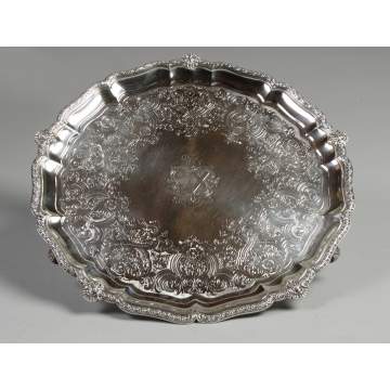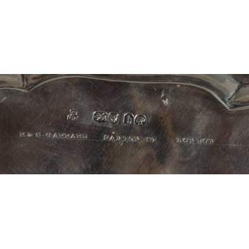 | 661. George III Sterling Salver, Shell border, scrolled feet, hand chased decoration. Hallmark RG. Retail by R & S Garand, Panton St., London. 46.48 Troy oz. Ht. 1 1/2" Dia. 14 1/2" Est. $500-$800 |