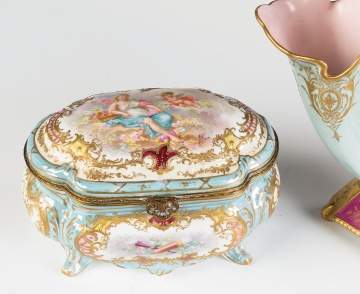 | All C. 1900. Lto R: Severs jewelry box; artist signed; French vase with Victorian lady. Sevres ewer with gold leaf. |