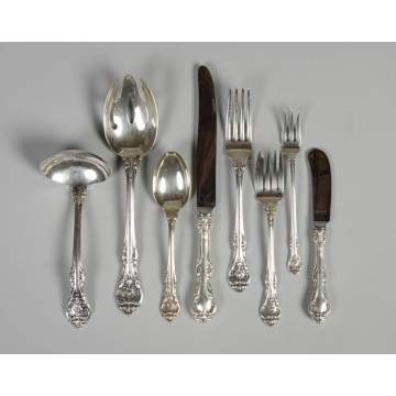 | 664. Group of Gorham Flatware, 10 Dinner knives, 8 3/4"; 2 Butter knives, 6"; 10 Dinner forks, 14.77 Troy oz., 7"; 10 teaspoons, 10.03 oz., 6"; 9 Salad forks, 10.57 oz., 6 1/4"; 1 Seafood fork, 0.73 oz., 5 3/4"; 1 sauce Ladle, 2.19 oz., 6 1/4"; 1 Slotted serving spoon, 2.19 oz., 8 1/4". Est. $700-$1,000 |