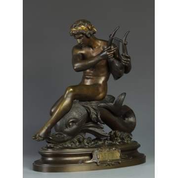 | 666. Ernest Eugene Hiolle (1834-1886) Bronze figure of "Arion", Sgn. & titled. Original patina. Ht. 20" W 19" D 10" Est. $800-$1,200 |