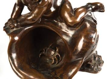 | C. 1900. Bronze of dancing putti. Louis-Ernest Barrias (French, 1841-1905) Bronze of seated putti on shell with a crab; Signed E. Barrias & F. Barbedienne Fondeur, Paris. |