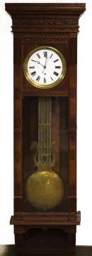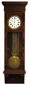 | Carved walnut and burl case; old finish. 8 day pinwheel weight driven brass movement with sweep second hand. Gadroon pendulum. Original beat scale. |