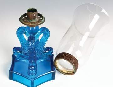 | Lot #: 397 Rare Boston Sandwich Glass Electric Blue Triple Dolphin Candle Lamp |