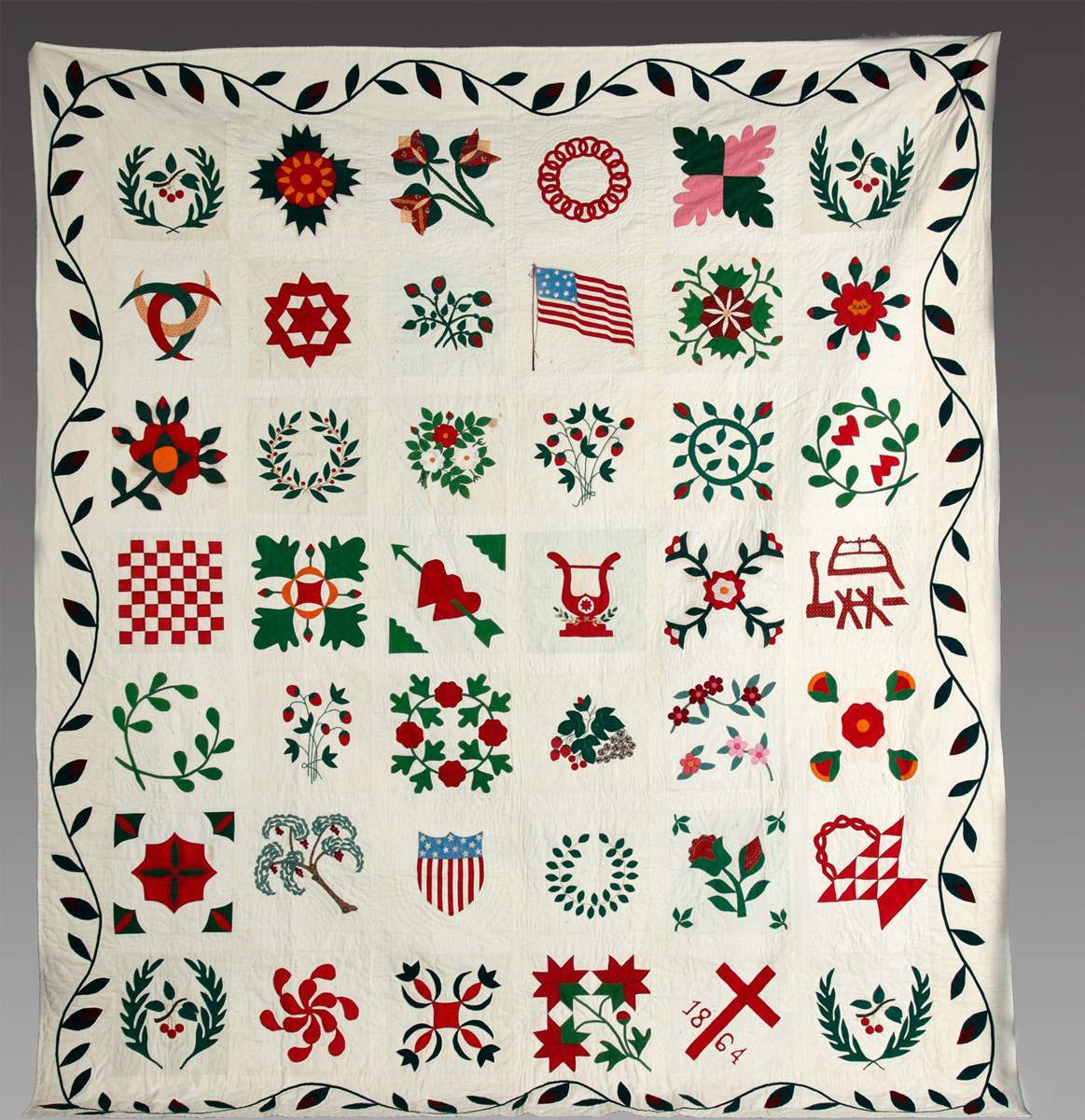 | 695. Rare 19th Cent. NY State Friendship Quilt, dated 1864. check info. Some slight oxidation. 8' 9" x 7' 7" Est. $3,000-$5,000 |
