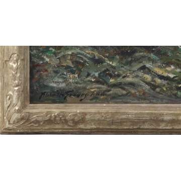 | 718. Abbott Fuller Graves (American, 1859-1936) "The Duck Pond", Signed lower left, Abbott Graves ANA. O/C. Carved into Reverse of Frame at Bottom: Philip N. Yates Maker. Excellent original condition & frame. No inpaint or restoration. Minute hole near signature. Property from the Strong National Museum of Play, sold to benefit the Collections Fund. 30" x 40" Est. $60,000-$100,000 Originally considered a member of the Boston School, Abbott Fuller Graves is best known as a painter of Kennebunkport, Maine. William Gerdts describes Graves as "the most important painter not only to live in the town but to devote much of his art to its pictorialization" (Art Across America, New York, 1990, vol. I., pp. 24-5). Born in Weymouth, Massachusetts, Graves studied painting both in New England and abroad, traveling to Paris in 1884, where he studied flower painting under Georges Jeannin, the foremost practitioner of the genre in Europe. His roommate during his foreign studies was Edmund C. T |