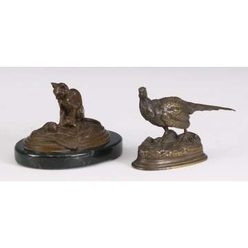 | Lot 14: Bronze Sculpture, Cat on a rug with ball of yarn, Sgn. Fremont. On marble base. Original patina. Ht. 4" W 5" (w/o base) Est. $400-$600 Lot 15: Antonio Bayre Bronze Pheasant, Sgn. Bayre. Original patina. Ht. 4 1/2" W 7" Est. $400-$600 |