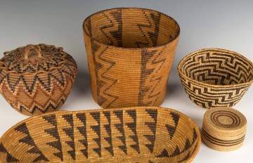 | C. 1900. Large - Pima. Lidded basket - Thompson River; piece of handle missing. |