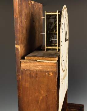 | Early 19th century. Mahogany with flame birch panel; old refinish and fret is an old replacement. Original painted kidney shaped dial. 8 day time only weight driven brass movement. |