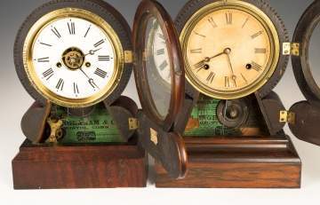 | L: Mahogany case; old finish. Dial replaced. 8 day time and strike spring driven brass movement with alarm. Good label. R: Rosewood case. 8 day time and strike spring driven brass movement with alarm. Partial label. |