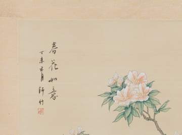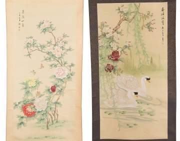 | Tree peonies; signed; Some creasing and folds; Image 43 1/2" x 20". Swans and flowers; signed; some minor creases and discoloration; Image 38" x 19". |