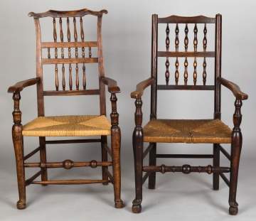 Condition Old patina and finish. One arm chair has some loss to rush, otherwise very good. |