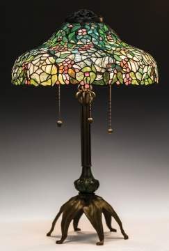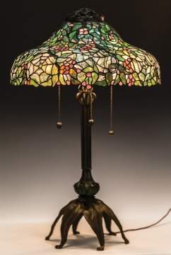 | Lot #: 526 Leaded Glass Table Lamp with Flowers and Spider Webs |
