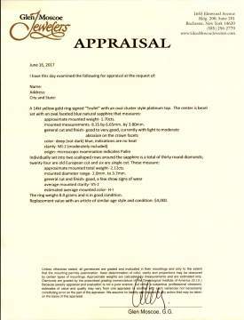| Oval faceted natural blue sapphire: approximately mounted weight 1.7 cts; 8.35 x 6.65 x 3.8 mm; cut and finish, good to very good; light to moderate abrasion on the crown facets; color deep, not dark blue, indications are no heat; clarity MI-2; Pailin origin. Total 30 round diamonds; approximately mounted weight 2.12 cts; average mounted clarity, VS-2; Estimated average mounted color, H-I. 8 grams. |