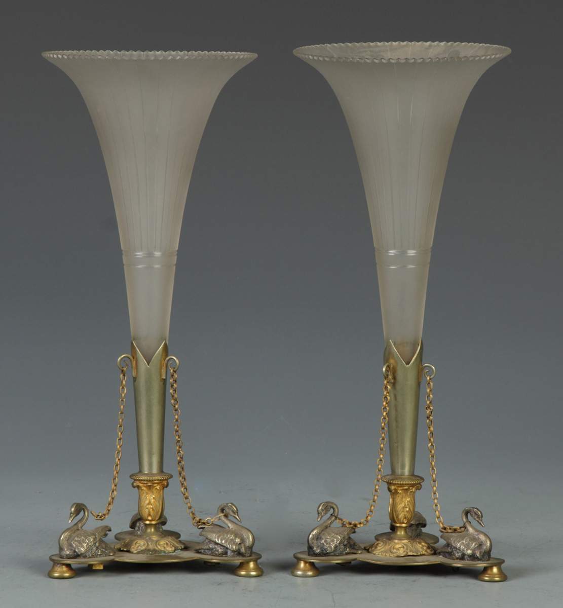 | Lot #: 51 Pair of Silver Patinated Brass & Glass Vases |