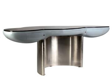 | Signed WC 1979. Stack laminated mahogany in steel grey; brushed aluminum base; black mirrored glass top. Originally made for the President of Columbia Bank Savings and Loan, Rochester, NY. |