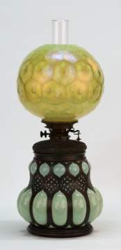 | Reticulated and blown out base; blown iridescent morning glory shade. Shade signed LCT Favrille. Base numbered 5548, brownish green patina. |