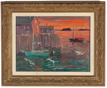 | Lot #: 633 Jonas Lie (American/Norwegian, 1880-1940) Harbor Scene at Sunset |