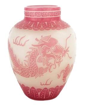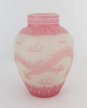 | Lot #: 173 Steuben Rose and Alabaster Vase with Dragon Design |