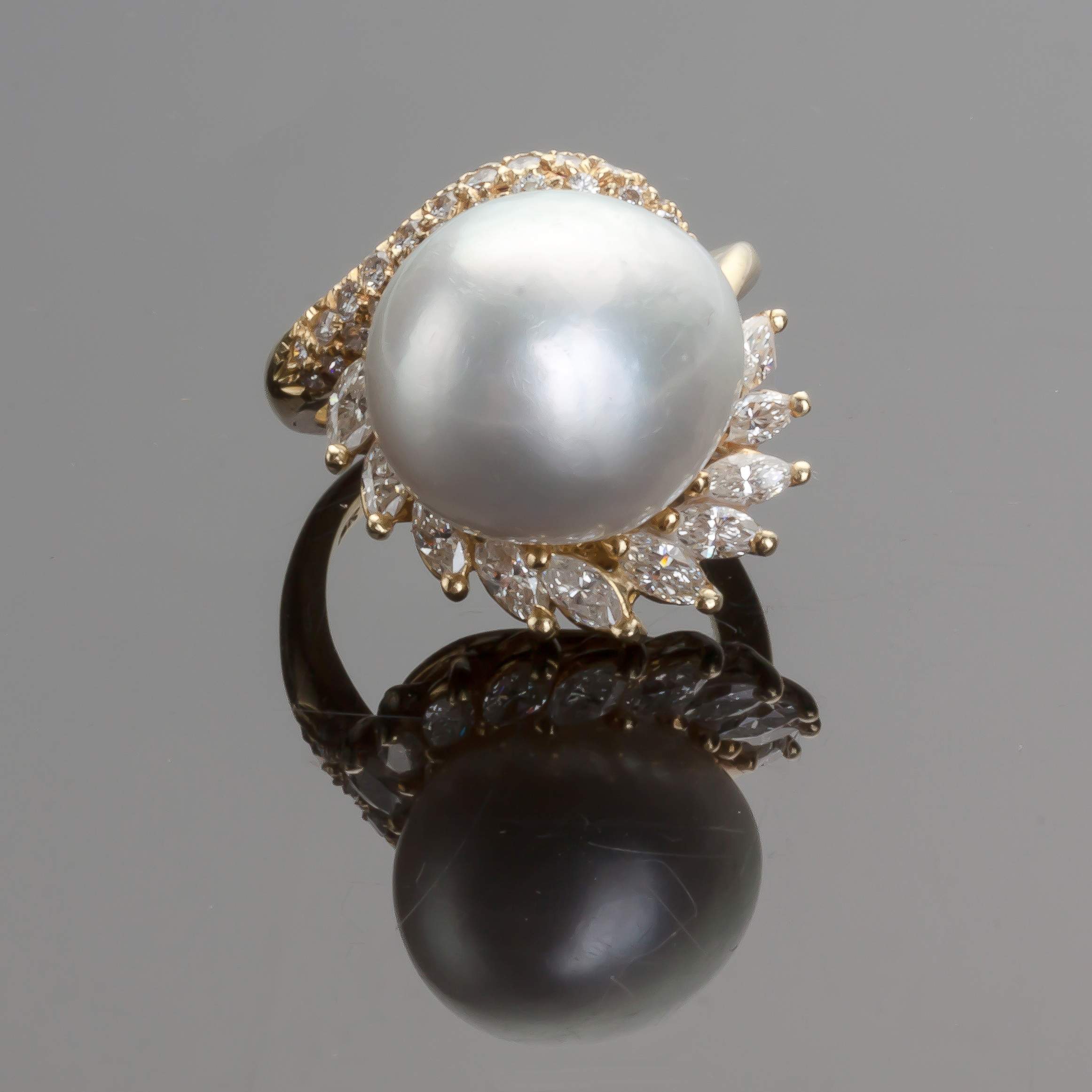 | 18K yellow gold. Silver white pearl is off-round button-type shape, good to very good luster, clean surface and a hint of pink overtones. Approximately 16mm x 14.6 mm. One side of ten marquis cut diamonds approximately .90 cts, average SI-1 clarity and estimated average color of G. Other side of twenty-three round brilliant cut diamonds, approximately .35 cts, average VS clarity and estimated color of H-I. 13 grams. Payment must be made by cash, check, certified check, money order, or wire transfer. Purchases paid for using personal checks will be held until payment has cleared the bank (typically 5-7 business days). Non-US purchasers must make payment by wire transfer. |