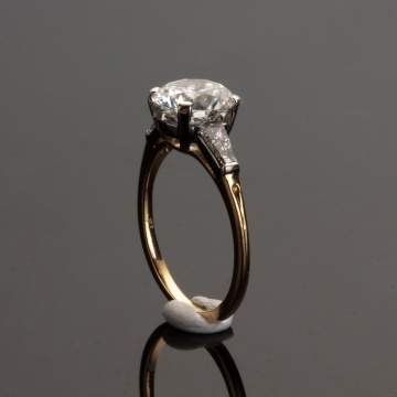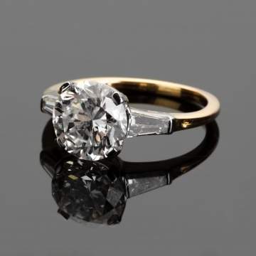 | GIA report #5192025591. Round brilliant diamond, 2.22 cts, 8.30 - 8.48 x 5.01 mm. Color F; Clarity VS1; Cut good; no fluorescence. 18k yellow gold and platinum, traditional style. Tapered baguette diamonds approximately .38 cts total, VVS, Average color F. |