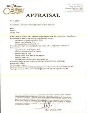 | A lady's platinum (10% Irid. Plat.) traditional style engagement ring. It is bar set on both sides of center with one tapered baguette diamond; these two measure tw .5 cts. VS-1, H Color. The center is a four prong basket type setting with an old European cut diamond 3.3 cts. SI-1 Clarity. Color M (no fluorescence, LW). Size 6.5. |