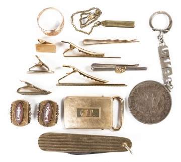 | Tiffany & Co. 14k pocket knife; 14k gold men's ring, 10.7 g; tie clips including one Tiffany 14k gold; Victorian cuff links; 1887 silver dollar. |
