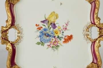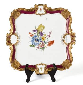 | 19th century. Hand painted flowers, butterflies, gold shells and scroll handles. |