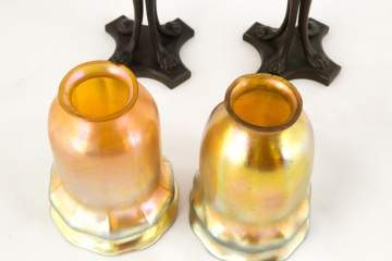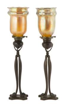 | Iridescent shades, signed LCT. Bases signed Tiffany Studios, NY 1201. |