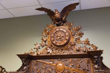 The extensive classical iconography used throughout the secretary clearly communicate Bookwalter’s intellectual and cultural élan in his various roles as a writer, scholar, world traveler, collector, politician, landowner and developer, in addition to his considerable wealth and societal prestige. A substantial classically-inspired pedestal base gives rise to a central desk panel featuring four doves mid-flight amongst a low relief field of delicately carved flowers and insects and framed in a band of foliage. Columns delicately encircled with ivy are topped by two busts of Italian masters representing art (Raphael, right) and literature (Dante, left). The portraits in turn flank a central frieze of cherubs in a woodland setting engaging in the four central themes of the secretary, from left to right: art, literature, astronomy, and surveying. Recessed bookshelves on either side of the central desk are flanked by pilasters in floral and arabesque relief, flaunting smaller panels featuring emblems of art (brushes and palette) and literature (parchment and quills). The top of the mantle similarly boasts panels symbolizing astronomy and surveying: a telescope and globe motif entwined in olive branches flanked by ornately carved supports lead to a clock face with central medallion containing a draftsman’s square, compass, ruler, and hourglass. An informal fifth theme of leadership crowns the structure, as an alighting dove above the clock face is supported by gracefully arching branches of laurel and oak, representing glory and heroism.