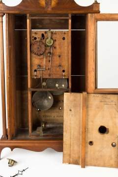 | Mahogany case, old refinish; crest restored. Original dial, repainted. Professionally repainted tablet. Time and strike movement with window shade alarm. Good label. |