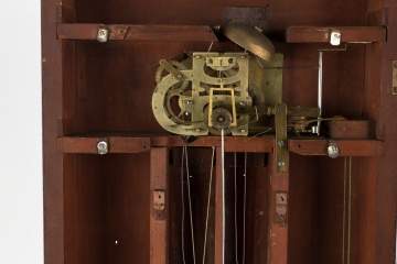 | Dovetailed case, old finish, possibly original. Original stenciled columns. Original red wash interior. Professionally repainted glass. Original mirror. 8 day time, strike and alarm weight driven brass movement. |