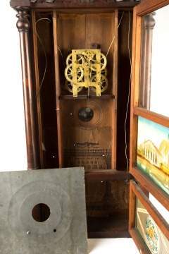 | Figured mahogany case with full columns and unusual heart shaped crest. Original painted metal dial. Old finish, probably original. Original reverse painted tablet. "By Industry we Thrive." 8 day time and strike weight driven brass movement. Label. |