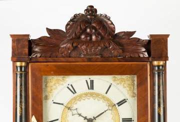 | Mahogany case with stenciled columns and carved splat, old refinish, original stenciling. Original painted wood dial. Professionally repainted tablet. 8 day time and strike weight driven wood works movement. Good label. |