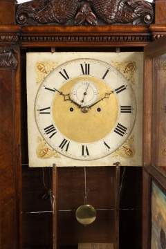 | Early 19th century. Mahogany case with carved cornucopia splat, pilasters with carved capitals and paw feet. Original painted metal dial. Moberg reverse painted tablet. 8 day time and strike weight driven brass movement, early style. |