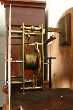 | Figured mahogany case. Silvered dial. 8 day weight driven brass movement. |