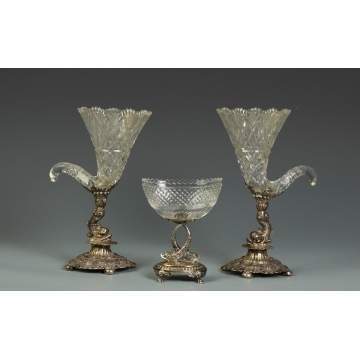 | 19. Pair of German 800 Silver & Cut Glass Cornucopias & Sweet Meat Dish, Stylized dolphin bases. Few small chips to glass. Ht. 10 1/2" W 7" & Ht. 6 1/2" W 5" Est. $800-$1,200 |