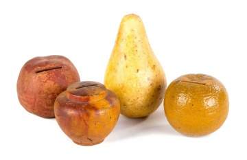 | Lot #: 407 Three Redware Banks and Stone Pear |