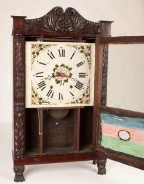 | Carved column, splat, and paw feet. Original printed label. Time and strike wooden works movement. |