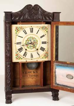 | Carved column, splat, and paw feet. Original painted dial and paper label. Time and strike, wood works movement. |