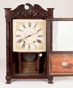 | Carved eagle, columns, and paw feet. Original painted dial and paper label. Time and strike, wooden works movement. |