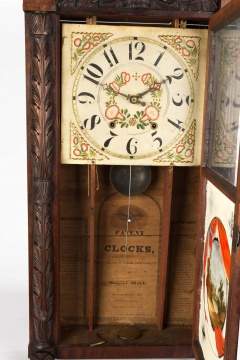| Mahogany case in old surface, carved columns, feet and splat. 30 hour wooden works Terry style movement. Original painted wood dial. |